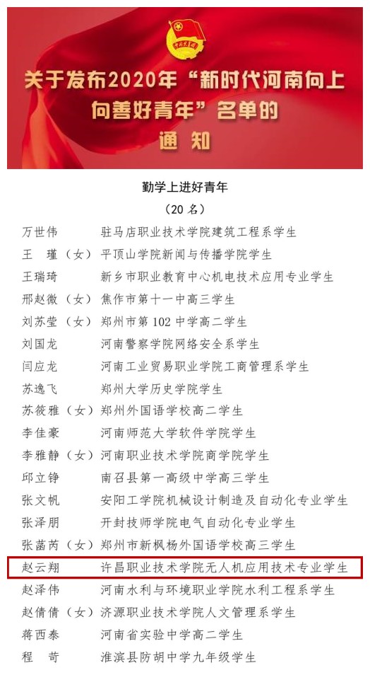 近日,河南省委宣传部、团省委联合发布2020年“新时代河南向上向善好青年”名单,此次发布共有五类100名优秀青年入围。我校航空工程学院无人机应用技术专业学生赵云翔榜上有名,被评为“勤学上进好青年”。