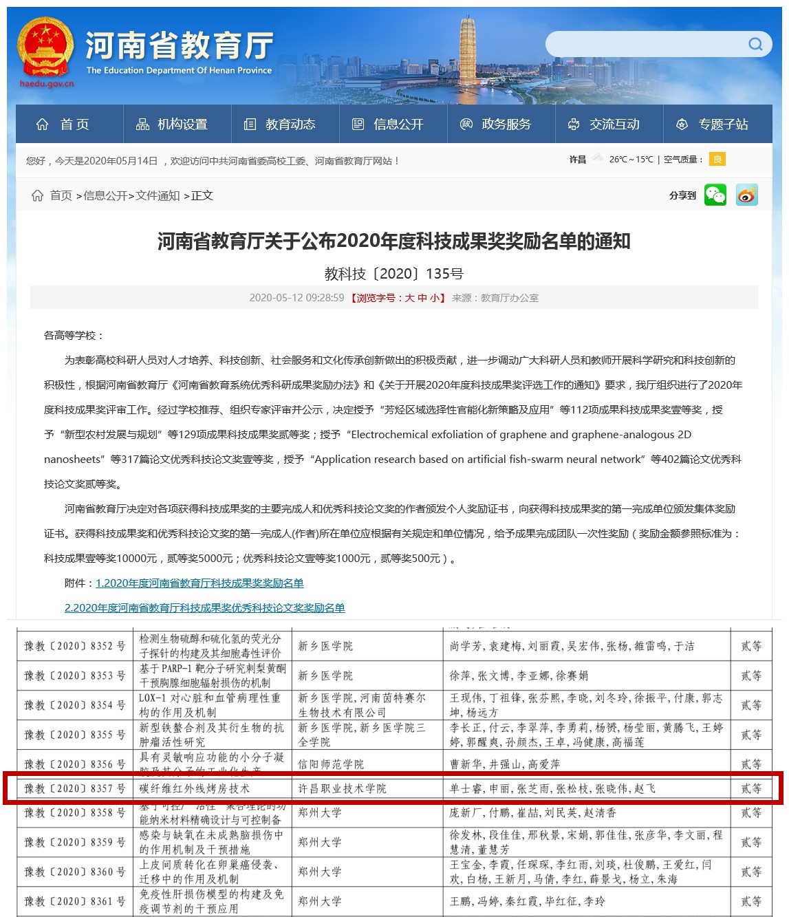 近日,根据《河南省教育厅关于公布2020年度科技成果奖奖励名单的通知》(教科技[2020]135号),在表彰的241项科技成果奖中,我校教师单士睿主持的《碳纤维红外线烤房技术》项目喜获二等奖。